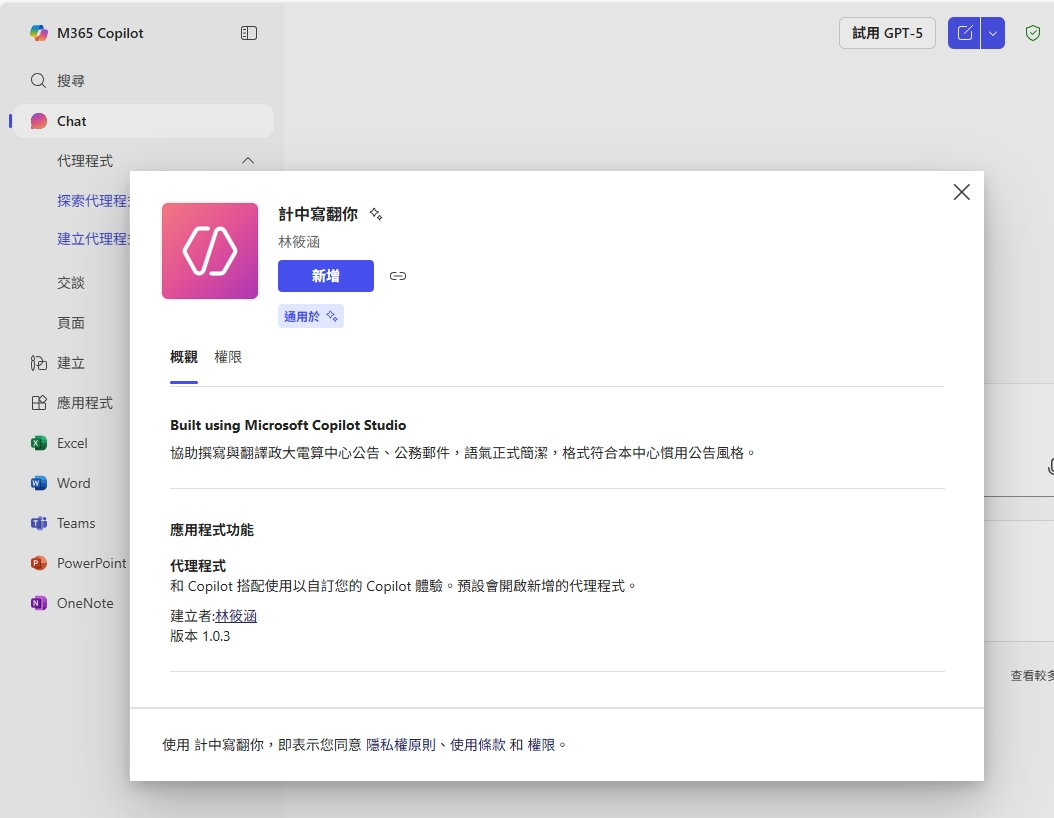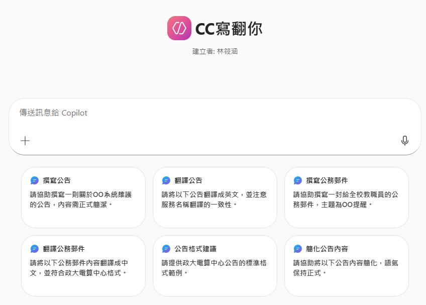 「CC寫翻你」是一款專為國立政治大學電子計算機中心日常業務設計的 Copilot Agent,支援撰寫與中英翻譯公告、公務郵件,協助行政人員快速完成格式正確、語氣合宜的資訊傳遞。